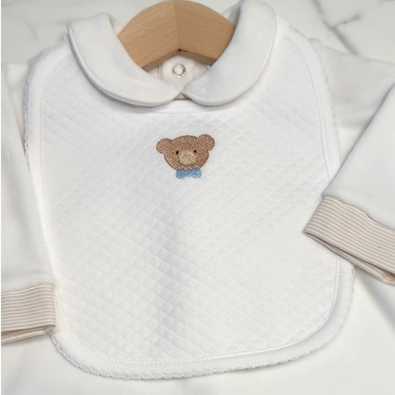 Een special edition van onze luxe bavet in doorstikte stof losange wit met super schattig beertje met strik geborduurd